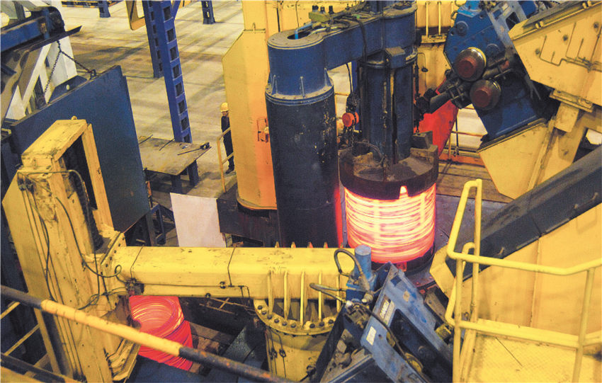 特殊鋼棒(卷)生產(chǎn)線是一條全連續(xù)式棒材和大盤卷復(fù)合熱軋生產(chǎn)線,加熱爐,連軋機(jī),KOCKS減定尺徑軋機(jī),飛剪,卷取樣,打包機(jī)等關(guān)鍵設(shè)備主要設(shè)備從法國(guó)斯坦因公司、意大利達(dá)涅利公司、德國(guó)kocks公司以及SIMENS及瑞典桑得斯公司引進(jìn)。該生產(chǎn)線減定徑機(jī)組德國(guó)KOCKS軋機(jī)是世界上生產(chǎn)圓鋼尺寸精度極高的軋機(jī),軋出的成品圓鋼精度等級(jí)能達(dá)到甚至高于1/4~1/5DlN1013標(biāo)準(zhǔn),并且可以實(shí)現(xiàn)自由尺寸軋制,可實(shí)現(xiàn)熱機(jī)軋制工藝技術(shù),全線的數(shù)字化控制和在線測(cè)徑技術(shù)、全線的控軋控冷技術(shù)、在線探傷技術(shù)。產(chǎn)品規(guī)格:?16mm~?90mm直條棒材和?14mm~?50mm大盤卷。直棒產(chǎn)品主要以軸承鋼、彈簧鋼、合結(jié)鋼、非調(diào)質(zhì)鋼、碳素結(jié)構(gòu)鋼、易切削鋼等產(chǎn)品為主。大盤卷產(chǎn)品主要以冷鐓鋼、優(yōu)質(zhì)碳素結(jié)構(gòu)鋼、合金結(jié)構(gòu)鋼、軸承鋼、易切削鋼、彈簧鋼等為主,是一條具有國(guó)內(nèi)一流、國(guó)際領(lǐng)先水平的棒材、大盤卷復(fù)合生產(chǎn)線,產(chǎn)品具有內(nèi)部組織均勻、表面質(zhì)量好、尺寸精度高、產(chǎn)品品類全等特點(diǎn)。